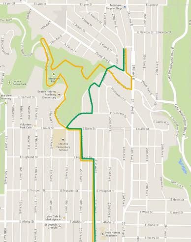 If we have to prioritize one route to be implemented within the context of the Central Area Neighborhood Greenway, we choose the “green route” (see map). The route we prefer heads up Peach Court from Interlaken Pl., right on Crescent, left of E. Galer, right on 20th, left on Highland and a right back on to 21st.