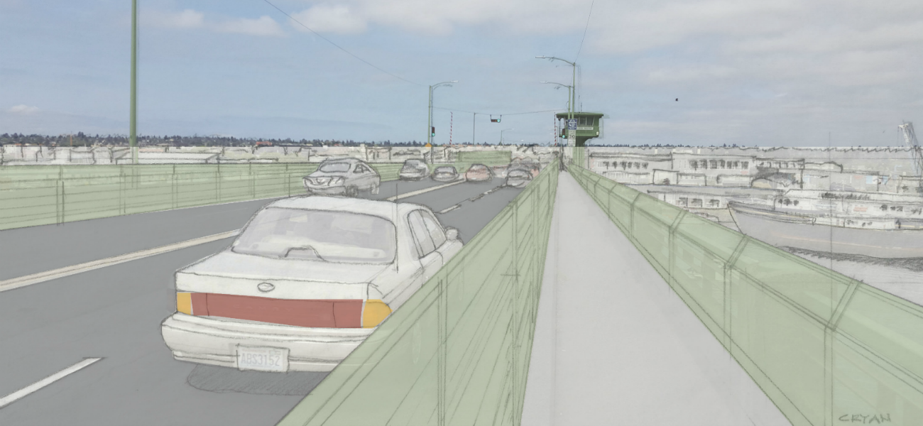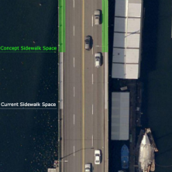 - Expanding the sidewalk on each side by one foot to the inside, reducing the outside vehicle lane width to 10 feet. This is the same lane width as across the bascule (middle) portion of the bridge.