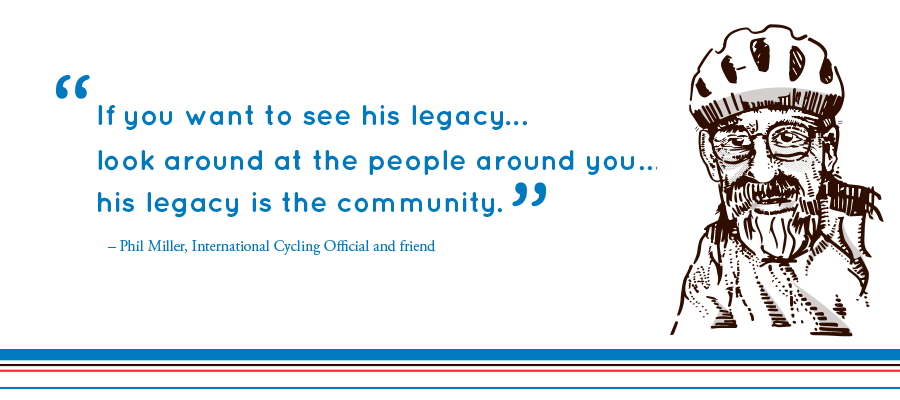 Jerry Baker will be missed immensely, but his legacy will live on. Phil Miller, International Cycling Official and friend said it best: “If you want to see his accomplishments, that’s easy, look around,” said Phil, referring to Cascade, WA Bikes, the Velodrome. “If you want to see his legacy… look around at the people around you… his legacy is the community.”