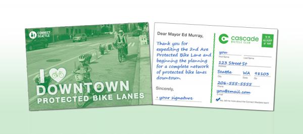 Ever since the Second Avenue Protected Bike Lane was installed last September, hundreds of people have been thanking Mayor Ed Murray for his leadership to build it in record speed as the beginning of a network of protected bike lanes in downtown. In fact, nearly 1,000 people have signed "I ❤ Downtown Protected Bike Lanes" postcards, and we're about ready to deliver the postcards to Mayor Murray next Thursday during Cascade's Bike Everywhere Breakfast. To celebrate getting to 1,000 signed postcards, Rosalie Daggett and Lindsay Buzzo of the Connect Downtown team created an amazing video. Check it out, then sign a postcard before it's too late.
