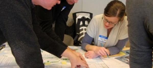 Representatives from Starbucks and SDOT review the draft bicycle network for the SODO area. On...