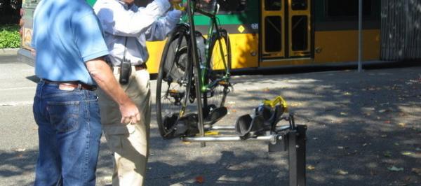 Here’s a nifty tool for commuters in North Seattle: a demo bus bike rack at North Seattle Community...