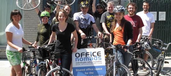 We had a tough time choosing the winner this week in our Group Health Commute Challenge Video, Photo and Story contest . We had so many stunning (and sometimes amusing) photo contributions and delightful stories, too. The job of the judges, however, is to choose, and having done so, we announce one first-place winner and two honorable mentions on the theme At work . **First, though, next week’s theme is Have fun and ride in style . Deadline is noon, Wednesday, June 1. And now, the winners. First place goes to Charlie Redell of Office Nomads! [caption id="attachment_6216" align="aligncenter" width="522" caption="Photo by Daya"] [/caption] Our team of elite judges liked this photo so much because not only does it fit the week's theme so well, but it also hits on something close to Cascade's heart: community. The photo shows two Group Health Commute Challenge teams from Office Nomads on Capitol Hill in Seattle. Are you familiar with Office Nomads ? The words on the sandwich board in the photo say it all: Shared office space for the independent worker. Office Nomads provides workplace community for people who might otherwise work in isolation at home or in the anonymity of a coffee shop. And these nomads are creating even more community through bicycling, which is what Cascade's mission is all about. Love it! Our two honorable mentions are stories. One story profiles a workplace in Redmond that offers secure bike parking but requires creative sink showering. The other story follows one individual's commute and includes a really cute picture of a dog.
