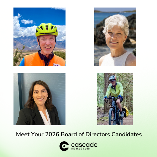 Electronic voting will be available to all Cascade members on Nov. 17, 2025 via email. Keep your eyes out for an email from Cascade Bicycle Club with your personalized voting link, and review your cascade.org account to keep your email address up to date. Please contact Cascade if your membership is active and you did not receive your personal e-ballot.