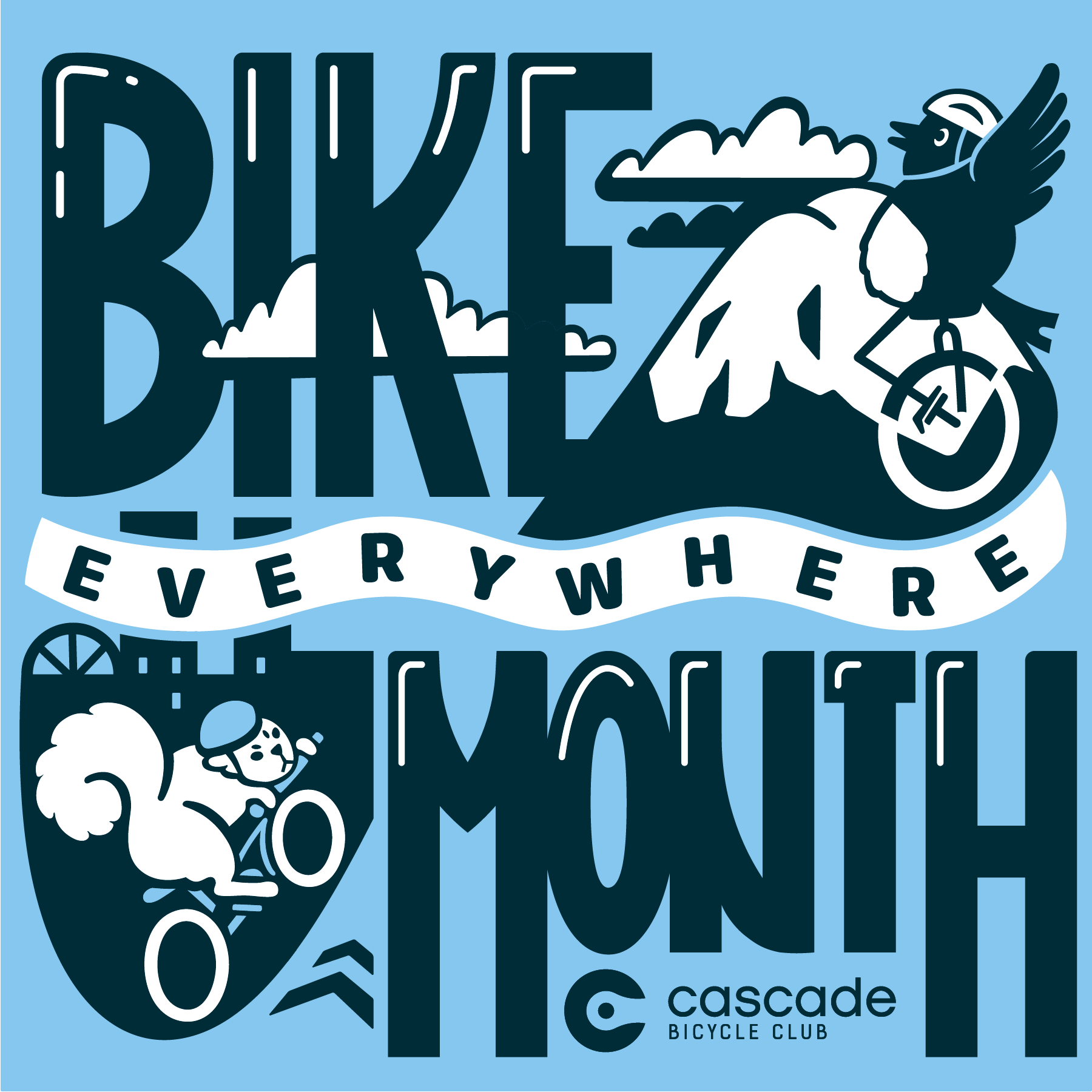Cascade worked with Seattle graphic designer Robin Hunt, who works to create positive impact, to design the new Bike Everywhere Month logo. It’s a whimsical take on the places you can ride and the critters you can see by bike.