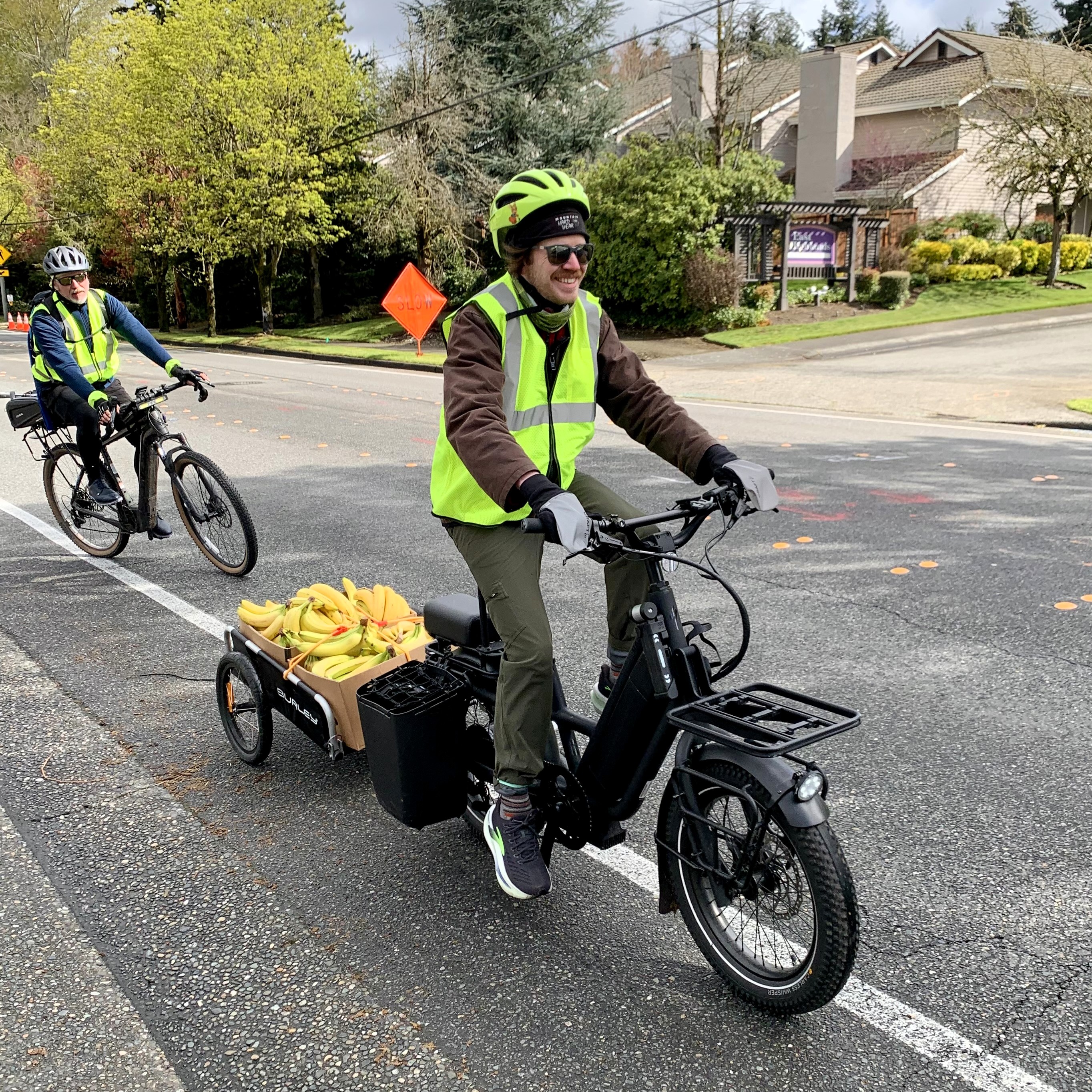 Volunteers ride all kinds of bikes: from road bikes to recumbents to e-cargo bikes. Landon (above pulling bananas) rides a Specialized Globe Haul e-bike.