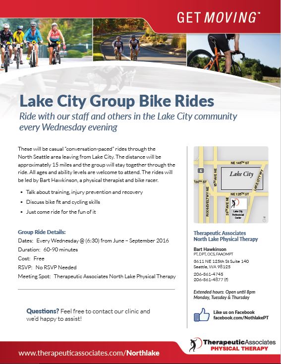 These will be casual “conversation-paced” rides through the North Seattle area leaving from Lake City. The distance will be approximately 15 miles and the group will stay together through the ride. All ages and ability levels are welcome to attend. The rides will be led by Bart Hawkinson, a physical therapist and bike racer.