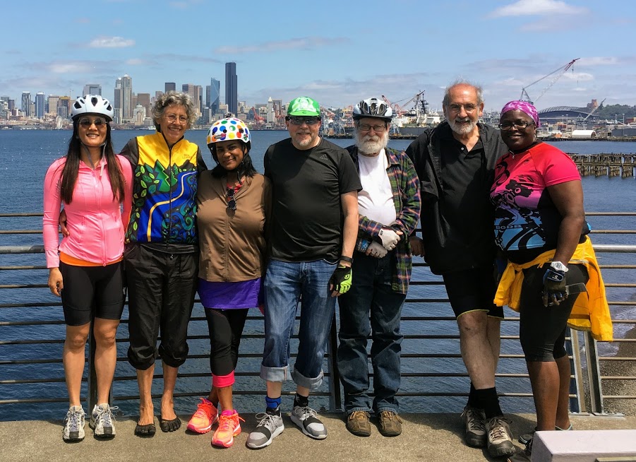 Senior Ladies On Wheels (S.L.O.W.) invite everyone of every age and identity to explore the fabulous vistas from Seattle's famous hills while barely breaking a sweat. Keeping to ridgetops, we climb slowly and gradually to Jefferson Park on Beacon Hill, Volunteer Park on Capitol Hill, and the Mount Baker Ridge overlook. There's no shame in walking a block or more. We always wait for each other when we get separated by stop signs, traffic lights, or differences in rider speed.